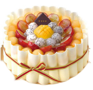 • 8寸鮮奶水果蛋糕,中心放各色時(shí)令水果,扇形巧克力插片